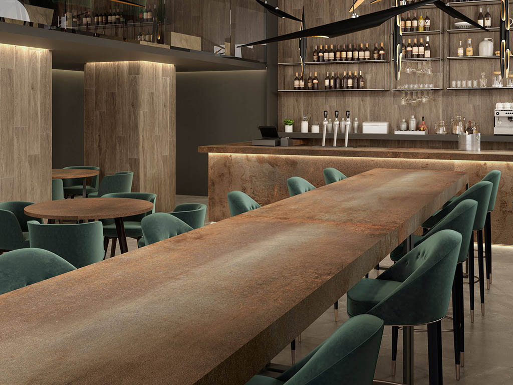 Предлагаем несколько примеров, где в отделке кафе или ресторана использовался керамогранит.
