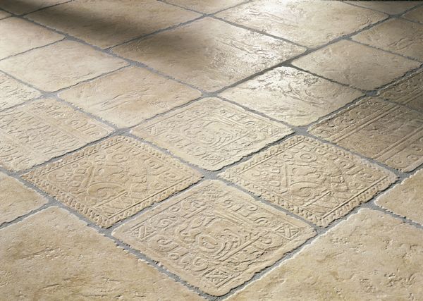 Еще одна «античная керамика» заслужила отдельного внимания. Это продукция ведущего испанского производителя, компании Ceracasa. Коллекция напольного керамогранита GOTICA полностью стилизована под старинные каменные плиты, покрытые благородной патиной. Искусственный налет патины на камне многие дизайнеры сравнивают с блеском на прекрасной антикварной мебели. Декоративные бордюры и вставки с витиеватым медным узором еще больше акцентируют античный стиль в интерьере. Керамическая плитка из этой серии наверняка придется по душе ценителям антиквариата.