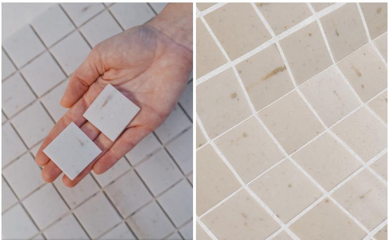 В обоих случаях они отдали предпочтение модели Ossis бежевого цвета. Изысканные изделия формата 4х4 см с матовым покрытием и изящными прожилками, воспроизводят красоту мрамора и натурального камня.