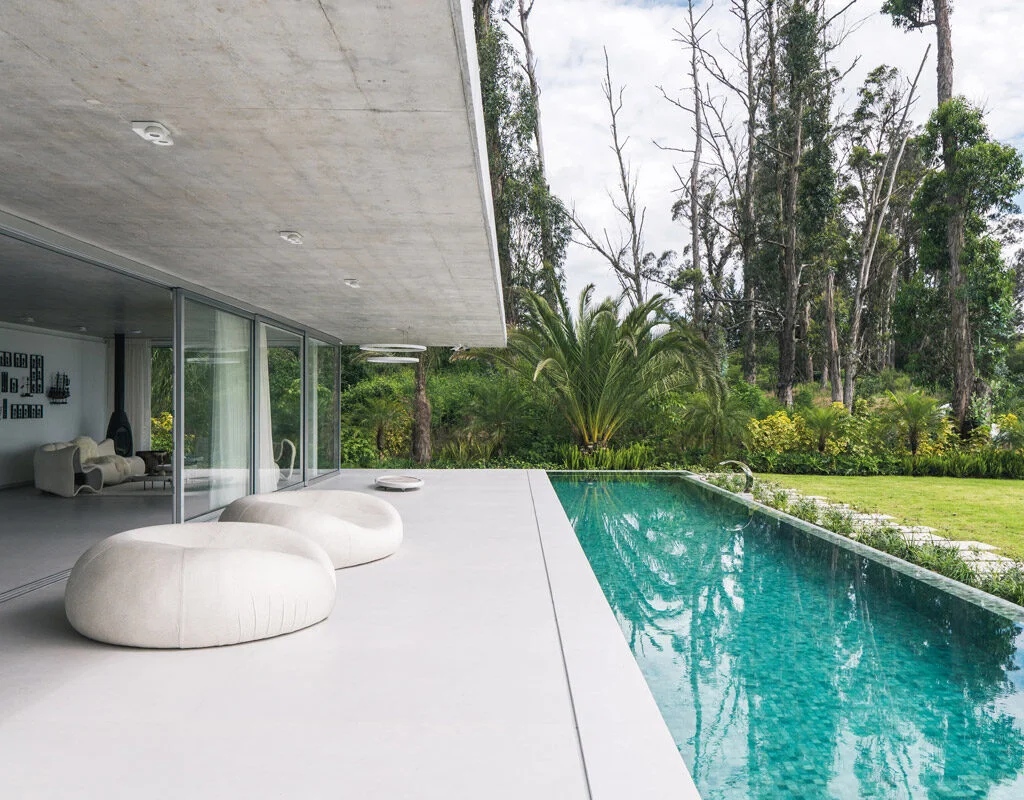 Бассейн виден изнутри дома, поэтому словно становится его продолжением. Зеленый оттенок мозаики идеально вписывается в окружающую среду и создает контраст с ярко-белым цветом крупной бетонной плиты, которая покрывает все здание.