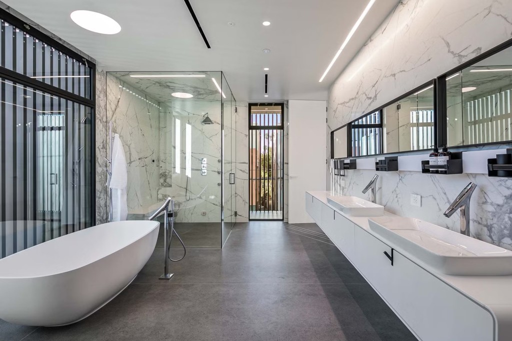Для отделки комнат и ванных выбрана плитка Geo, Touché и Syros, хотя основным облицовочным материалом все же остается коллекция Astral. Комбинация различных моделей MDi обеспечивает уникальный дизайн. Многофункциональные изделия подходят для создания однородной эстетики с высокой добавленной ценностью. Помимо прочего MDi являются хорошими проводниками тепла, поэтому во всем доме установлены теплые полы.