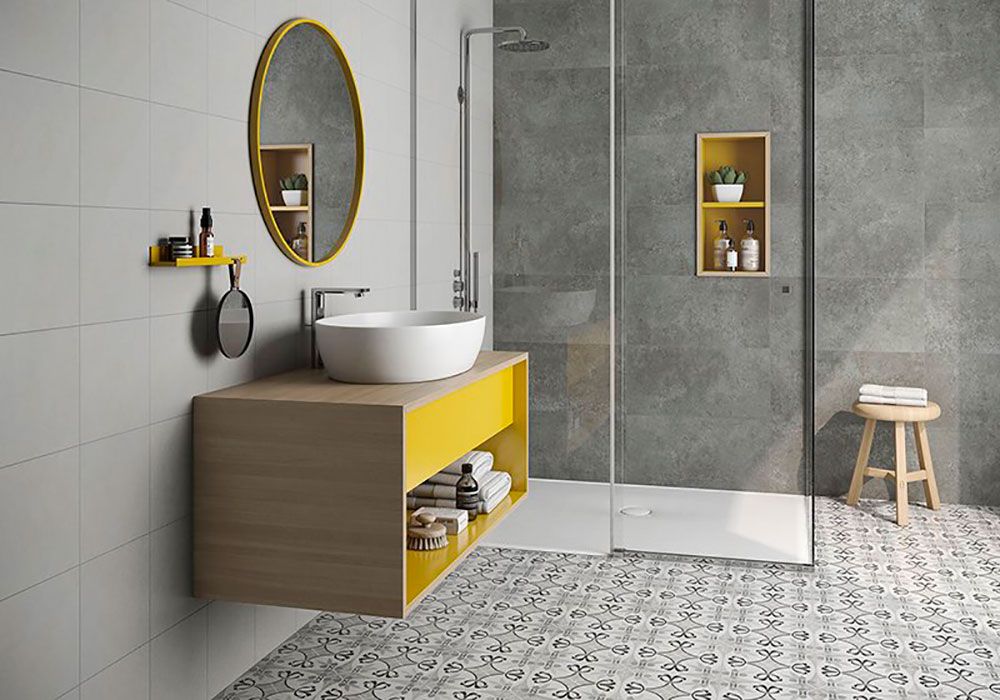 Гидравлическая плитка уместна и для облицовки стен. В данном случае модель Provenzal (цветная) формата 75x75 см использована для стены, где расположены умывальники. Она хорошо сочетается с напольной плиткой «под дерево» Kingswood (оттенок ржавчины), чтобы создать ощущение непрерывности между жилой комнатой и зоной душевой.