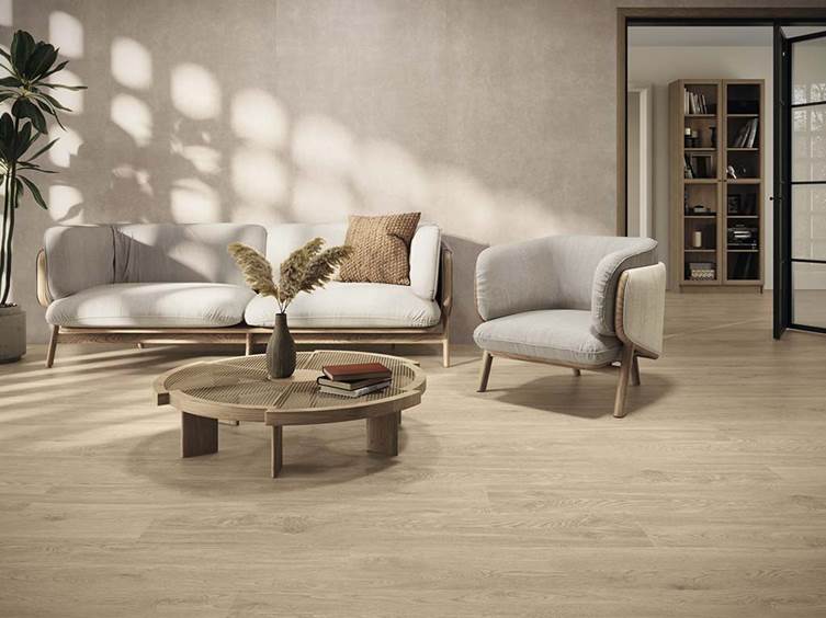 Для усиления эффекта подлинности важно продумать укладку. Форматы «под доску» хорошо работают в разбежку или «елочкой», а крупноформатный керамогранит помогает избежать лишней дробности. Матовая поверхность без глянца — обязательное условие, ведь именно она создает ощущение теплого, «живого» материала.