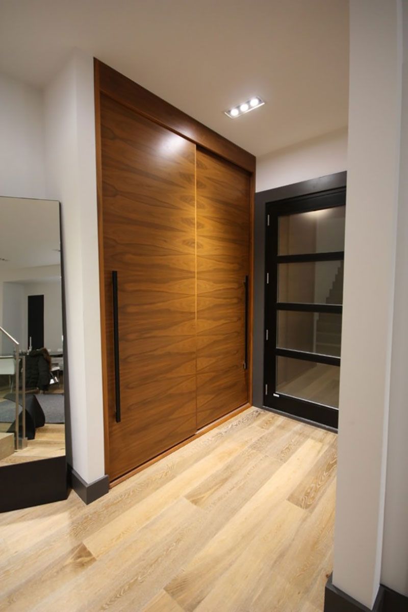 Узкий коридор с грамотной организацией пространства может быть не хуже любого другого помещения в доме. Деревянные панели встроенных шкафов отлично гармонируют с напольной отделкой из плитки в имитации все того же натурального материала.