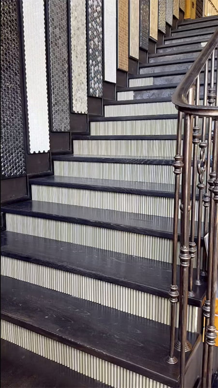 Ректифицированный экструдированный керамогранит с матовыми и блестящим покрытием в размере 10x39см отличают легкие бороздки и объемные формы, что позволяет монтировать их без швов.