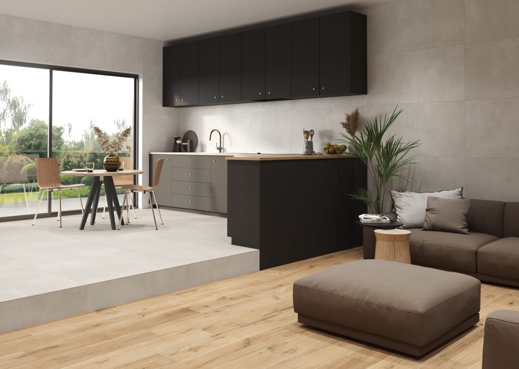 При подборе напольной плитки для кухни, соединенной с гостиной, необходимо принимать во внимание как функциональность, так и эстетику.