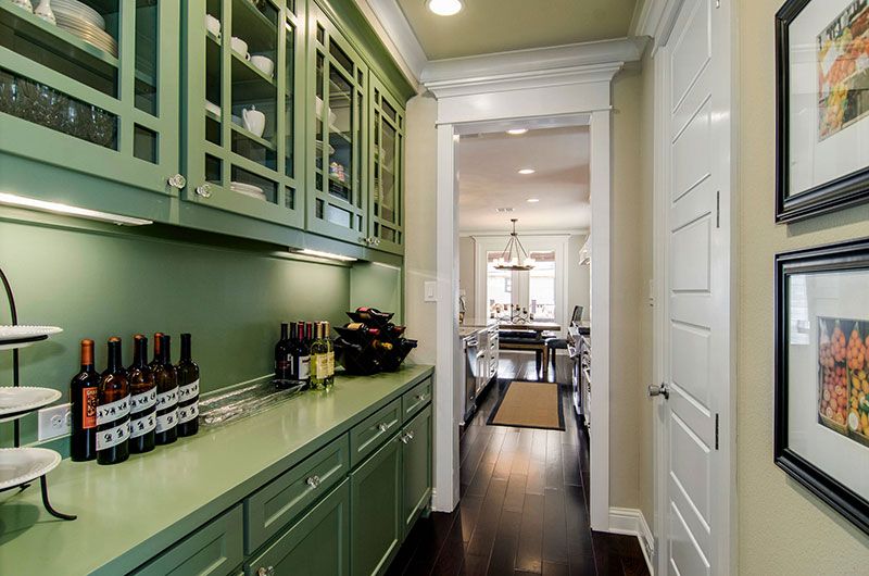 Самодостаточный и роскошный оттенок зеленого «виридиан» окрасил кухню в цвет наступающей весны и молодости. Есть в нем что-то от хвои и неба. Идеально в тон к мебели подобраны все предметы окружающей обстановки: медная посуда, черные мраморные столешницы, керамогранит «под паркет». Демонстрация хорошего вкуса, только и всего.