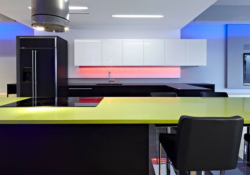 Футуристический дизайн необычайно грамотно украсил просторную кухню, превратив ее в самое яркое место в городских апартаментах. Желто-зеленая столешница — хотя и доминирующий декор, однако не единственный в этой палитре красок. Большое значение здесь имеет неоновое освещение, создавшее иллюзию присутствия в интерьере голубого и розового цвета. Но, иллюзия, как известно, вещь зыбкая, а столешница — вот она, реальная, осязаемая, функциональная.