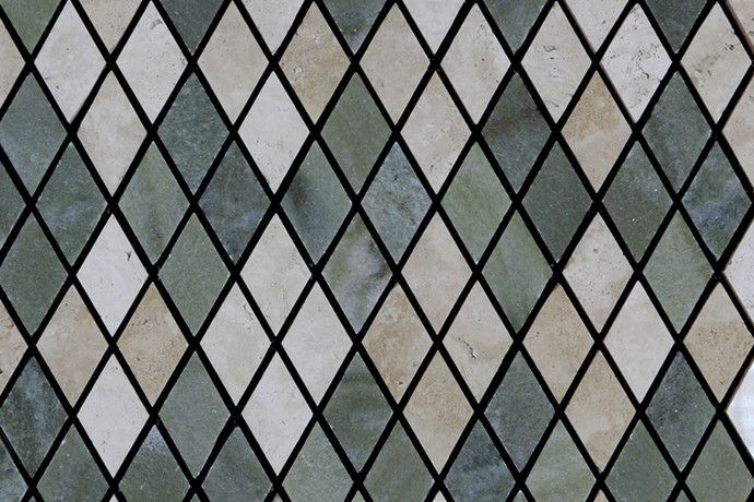 Глянцевая мозаика ромбовидной формы в серо-бежевых тонах, представляющая собой травертин на сетке. Размер модулей 30х30 см.