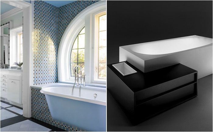 Совместить красоту отдельно стоящей ванны и встроенной поверхности, чтобы на нее было удобно поставить мыло и другие принадлежности, поможет частично встроенная чаша. Это особенно актуально для комнат с ограниченным пространством.