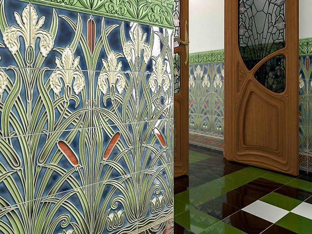 Однако главное украшение коллекции, все же, – панно Conjunto Lirios с флористическими мотивами, образующие при укладке великолепное панно 40х80 см в стиле "модерн". С помощью цоколя Rodapie Lirios теплых тонов с волнообразным и графическим узором в районе напольного покрытия можно сделать контрастную декорацию.