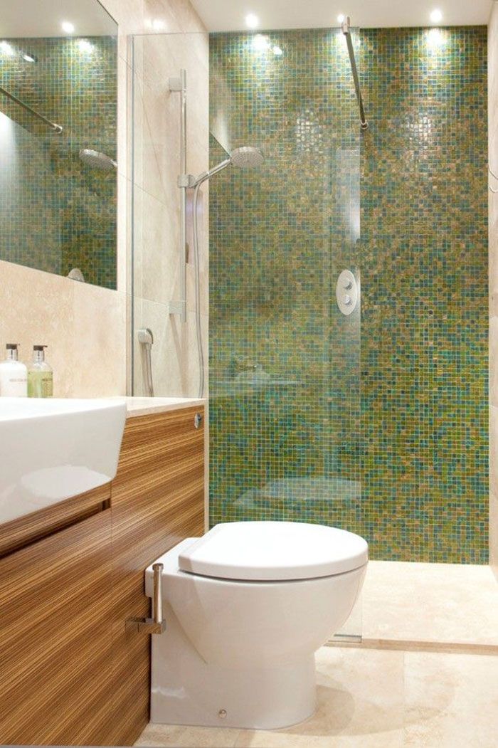 Санузел с душевой кабиной, где основной акцент сделан посредством мозаики сочного зеленого оттенка. На фоне белых стен и пола она смотрится особенно свежо и выразительно. Кроме того, стоит отметить практичность этого покрытия в каждодневной эксплуатации.