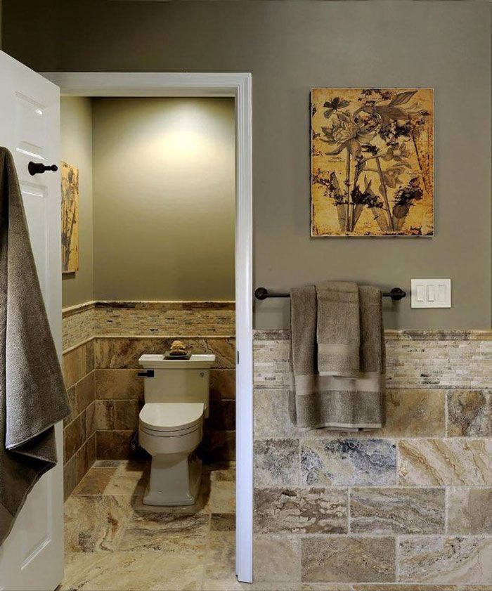 Плитка «под камень» с ярко выраженной фактурой природного материала. Облицовочное покрытие прямоугольной формы с мозаичными вставками заняло нижнюю часть стены санузла, и продолжилось на полу в виде квадратных имитаций натурального камня.