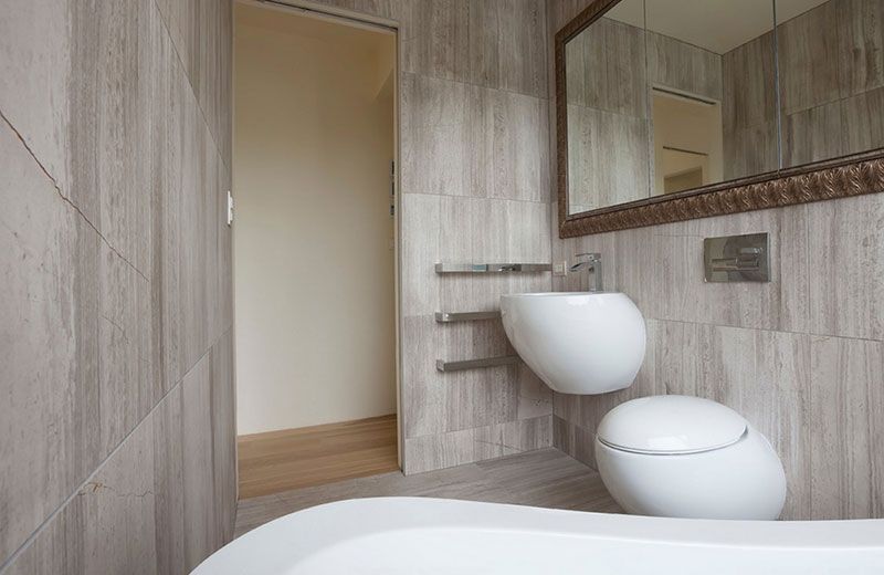 Керамогранит гигантского размера появился на современном рынке стройматериалов сравнительно недавно, но уже успел попасть в поле зрения дизайнеров. В отделке этого санузла крупноформатные плиты серого цвета идеально вписался в минималистический стиль интерьера.