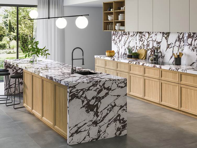 - Гигиеничность и прочность. Поверхность с твердостью 7-8 по шкале Мооса не поцарапает нож, не поддерживает рост бактерий и не требует специального ухода. Современные форматы плит длиной до 3,2 метра минимизируют количество швов, создавая монолитное пространство.