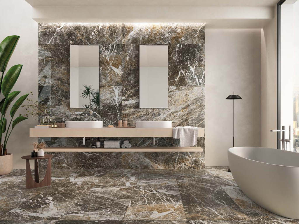 Завершает обзор керамогранит Ceppi Apuani Forest и Ceppi Apuani Quartz с графикой агломератов. Если первый отличается яркостью за счет белого цвета и контрастных включений, то второй выпущен в приглушенных тонах серого с золотистыми прожилками камня. Оба артикула доступны и с матовой, и полуполированной поверхностью, в форматах 80х80 см, 80х160 см и с 9 мм толщиной для каждой.