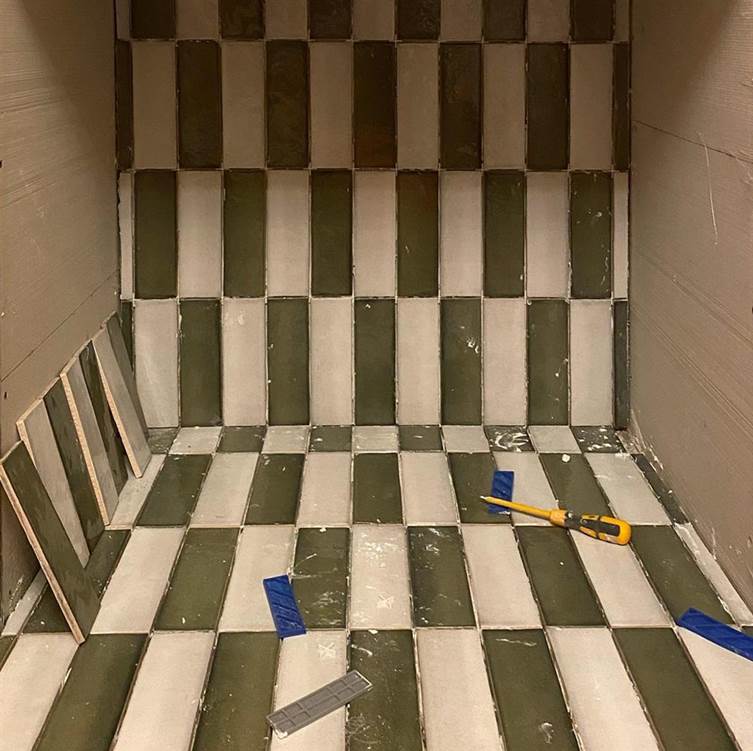 - Расчет материала. Определите нужное количество плитки: половина на один цвет, половина на другой, плюс запас в 10% на подрезку и брак.