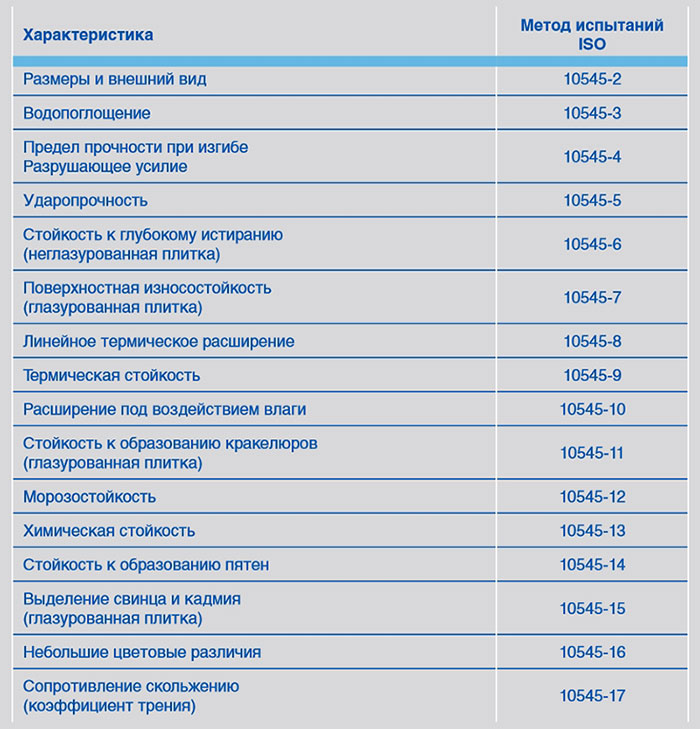 ISO 10545 — описывает методы испытаний для определения качественных характеристик плиток в зависимости от условий их применения. Этот стандарт состоит из 17 частей (от ISO 10545-1 до ISO 10545-17), в каждой из которых представлен один метод испытаний. В частности, часть 1 устанавливает критерии и процедуры, которым необходимо следовать при отборе образцов и контроле одной партии плиток, а именно, определяет число отбираемых образцов для каждого из испытаний, критерии приёмки и отбраковки. Часть 17, посвящённая сопротивляемости скольжению, «пуста», так как не было достигнуто согласия относительно метода испытаний. Каждая из остальных частей представляет один метод испытаний, как указано ниже в таблице.
