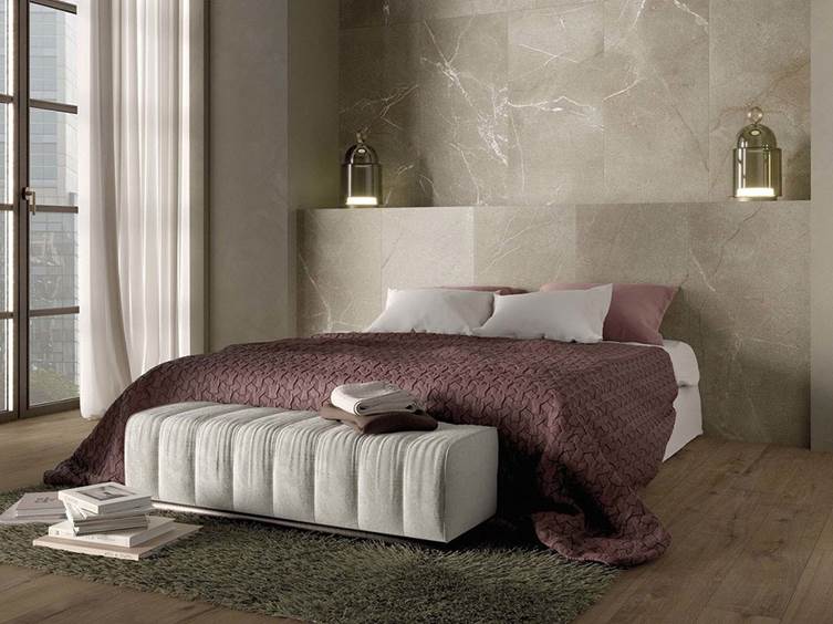 Хотите придать спальне нотку роскоши? Создайте небольшую акцентную стену за прикроватными тумбами с плиткой в кремовых тонах и дополните интерьер деревянной мебелью. Дизайнеры влюбляются в мягкие песочные оттенки и неудивительно: они дарят спокойствие и утонченность.