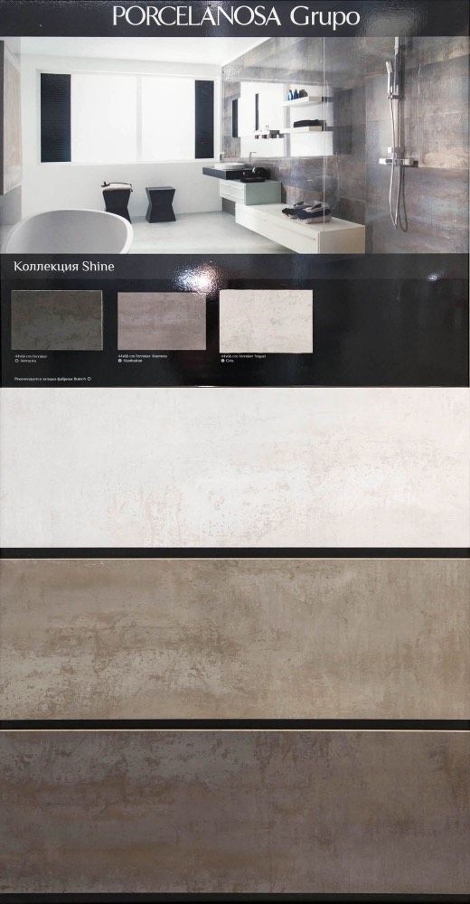 Серия плитки Shine состоит из трех крупноформатных элементов 33,3х100 см черного, алюминиевого и латунного цветов. Рисунок плитки аналогичен расцветке Ruggine, различие только в глянцевой поверхности. Поверхность всех элементов плитки Shine очень правдоподобно имитирует металл. Рисунок плитки переливается, в зависимости от того, под каким углом на него падает свет.