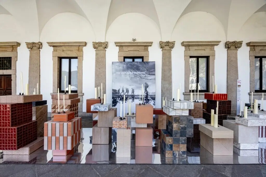 Decocer принимает активное участие в инсталляции с центральным элементом. Керамический тотем изготовлен с помощью коллекций Volcano и Stratos. Вертикальная скульптура привносит с собой текстуру, контраст и материальное присутствие. Кроме того, она естественным образом связана с концептуальным посланием инсталляции. Поверхности, цвета и покрытия обеих коллекций подчеркивают диалог между тьмой и светом.