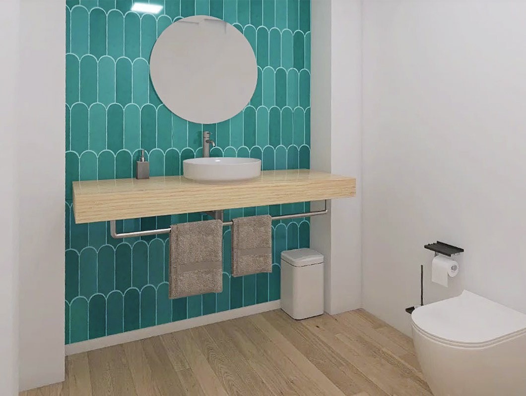 В данном проекте ванной использована керамическая плитка из белой глины Fan в форме рыбной чешуи. Изделия оттенка терракоты с матовым покрытием позволили наполнить ванную комнату жизненной энергией и цветом. Эти модели способны преобразить любое пространство. В результате получился интерьер в естественном стиле, который отличает яркая индивидуальность.