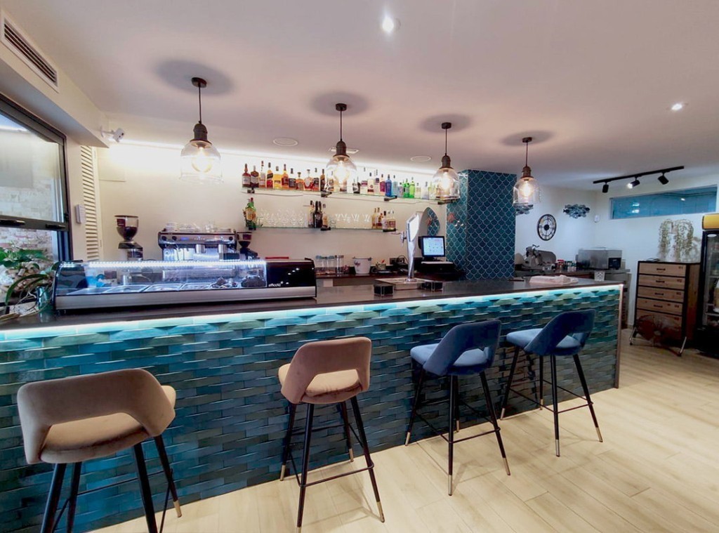 В свою очередь, колонна, украшенная экструдированным керамогранитом Squama от Natucer изумрудного цвета в эксклюзивной форме рыбной чешуи (12,7x6,2см), прекрасно гармонирует с барной стойкой, добавляя в интерьер глубины и текстуры. Для пола выбраны модели из коллекции Alquézar размера 20x120см, вдохновленные теплотой дерева. Они завершают ансамбль, основой которого послужили природные и уютные элементы. В результате получилась уникальная атмосфера, располагающая к тому, чтобы насладиться вкусной едой.