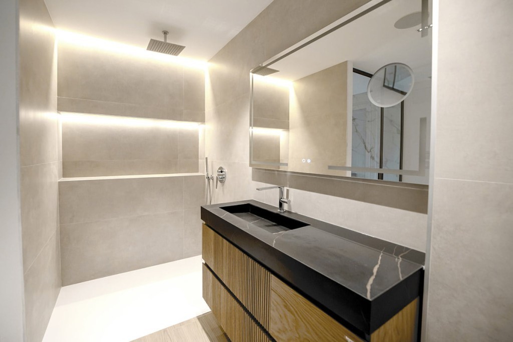 Стены облицованы экструдированным керамогранитом кремового оттенка, который привносит в атмосферу теплоту и спокойствие. Изделия формата 60x120см с матовым покрытием и ректифицированной кромкой, становятся залогом аккуратного и современного дизайна. Изящная однородная поверхность красиво отражает свет, визуально расширяя помещение и обеспечивая ощущение безмятежности.