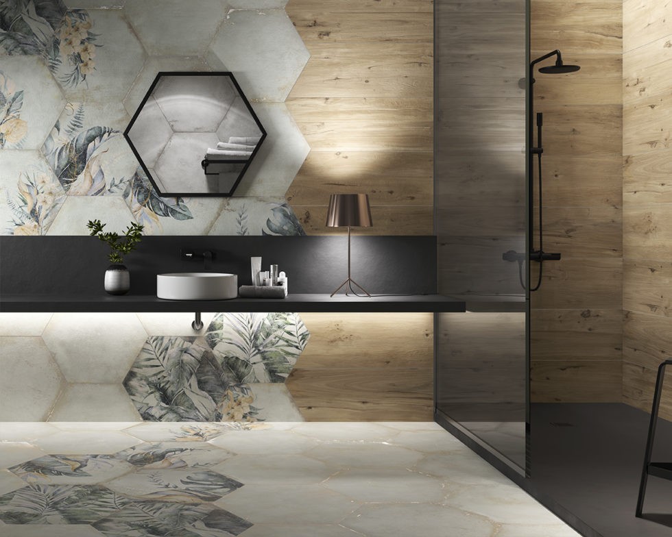 Шестиугольный формат 23x27 см привносит в отделку полов и стен красивую геометрию.