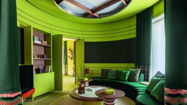 Преобладание в пространстве яркого зеленого цвета не случайно: он символизирует обновление и творчество. Цвет в сочетании с акустическим дизайном помещения способствует мультисенсорному опыту. Можно оценить как безупречную эстетику, так и несравненное качество звука культовых продуктов, таких как установка Beovision Theatre.