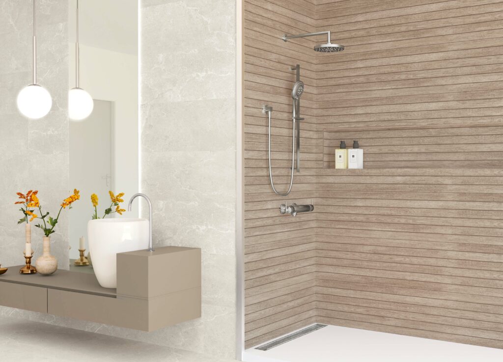 — На фото: на стенах плитка Stryn формата 60x120 см (базовая и Feels), на полу – Promenade пепельного оттенка, формата 120x120 см