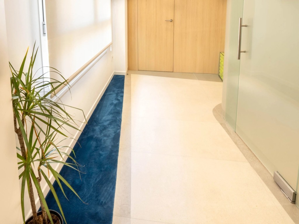 Чтобы добиться такого ощущения, при переходе из внешней части клиники во внутреннюю была использована напольная плитка TAU. Ее цвет привносит обволакивающий эффект. Синее ковровое покрытие в этом своеобразном вестибюле выбрано в знак уважения к корту, на котором теннисист и пациент клиники Carlos Alcaraz достиг важной вехи в истории спорта, что придает пространству особый символизм.