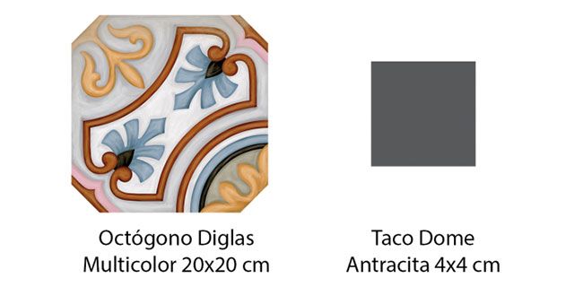 (на фото восьмиугольная плитка Diglas, цветная, формата 20x20 см и вставка Dome, антрацит, формата 4x4 см)