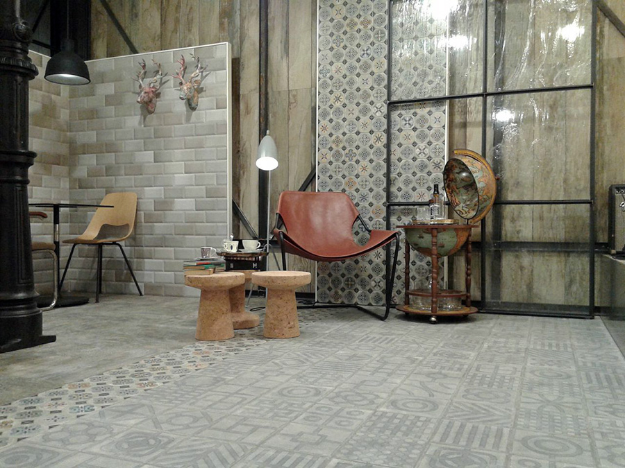 Керамическая плитка была распределена по маленьким и увлекательным пространствам, воспроизводящим различные интерьеры.