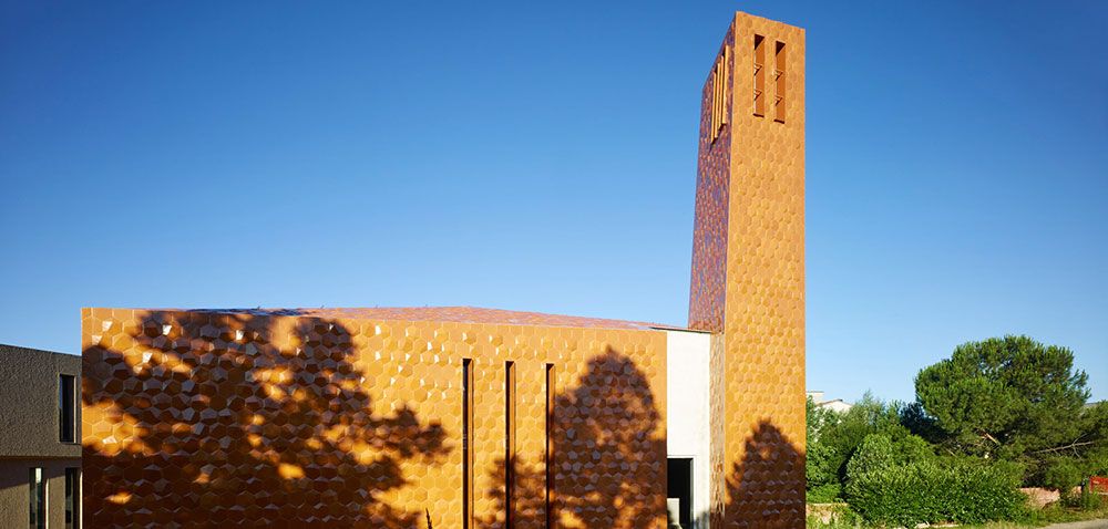 В процессе разработки и создания часовни Милосердия в Террануова Браччолини керамический гранит стал главным элементом, определяющим саму архитектуру. Специально спроектированная студией Archea Associati в сотрудничестве с компанией Tagina почти непрерывная поверхность из шестиугольных плиток покрывает почти весь экстерьер, переходя на кровлю, имеющую довольно сложную геометрию, и отличает часовню отрядом стоящего рабочего здания. И хотя оба сооружения являются детищем одного формального подхода, такое решение украшает часовню и делает ее более прочной.