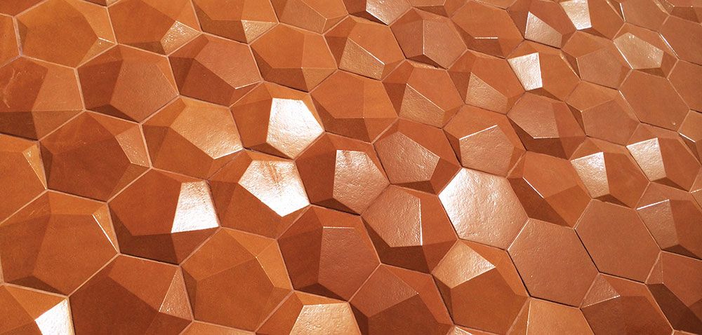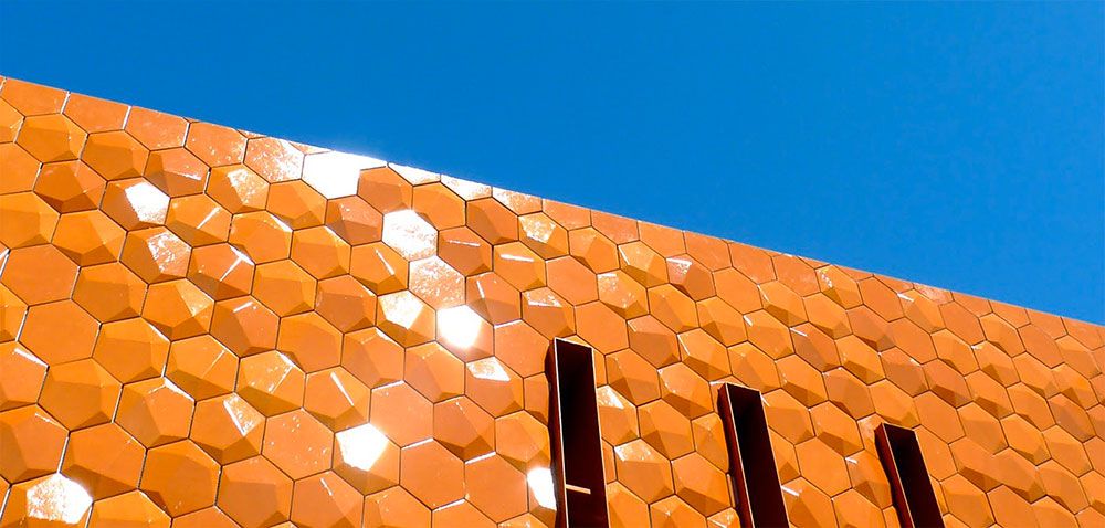 Плитка Esagona представляет собой призматическую шестиугольную фигуру с длиной стороны 19,5 см, она выполнена из керамического глазурованного гранита, наклеенного на металлические перфорированные панели по принципу вентилируемых фасадов. В облицовке чередуются трехмерные и плоские элементы, соединенные швами из окрашенного силикона, что создает единый и одновременно вибрирующий фон с переливчатым эффектом под воздействием света.