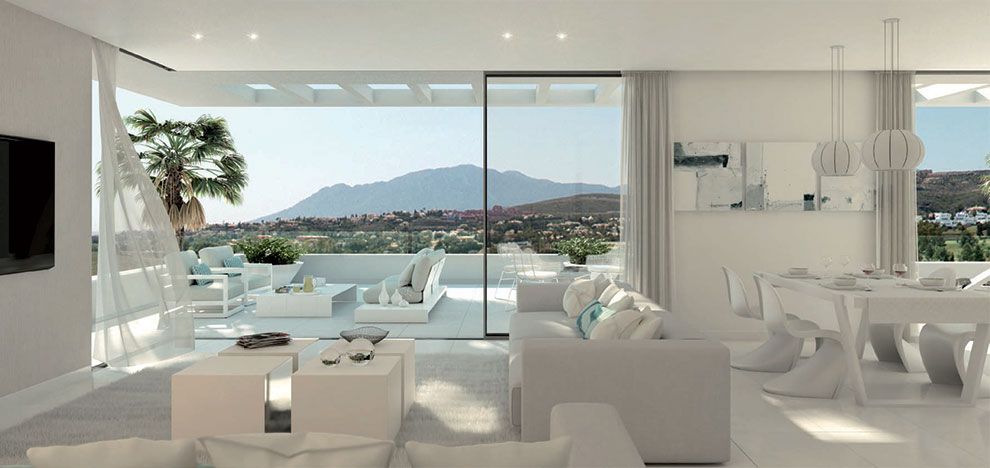 Интерьеры с изобилием белого цвета отличаются прекрасным естественным освещением. Преобладают прямые линии, задающие современный стиль и модную простоту обстановки. Планировка квартир выстроена вокруг элегантной кухни Emotions от компании Gamadecor: она примыкает к гостиной со столовой, а та, в свою очередь, гармонично сливается с окружающим пейзажем благодаря большим окнам. Ощущение непрерывности пространства усиливается за счет плитки Soul Frost Pulido 59,4x59,4 см от Urbatek, украшающей полы во всех комнатах.