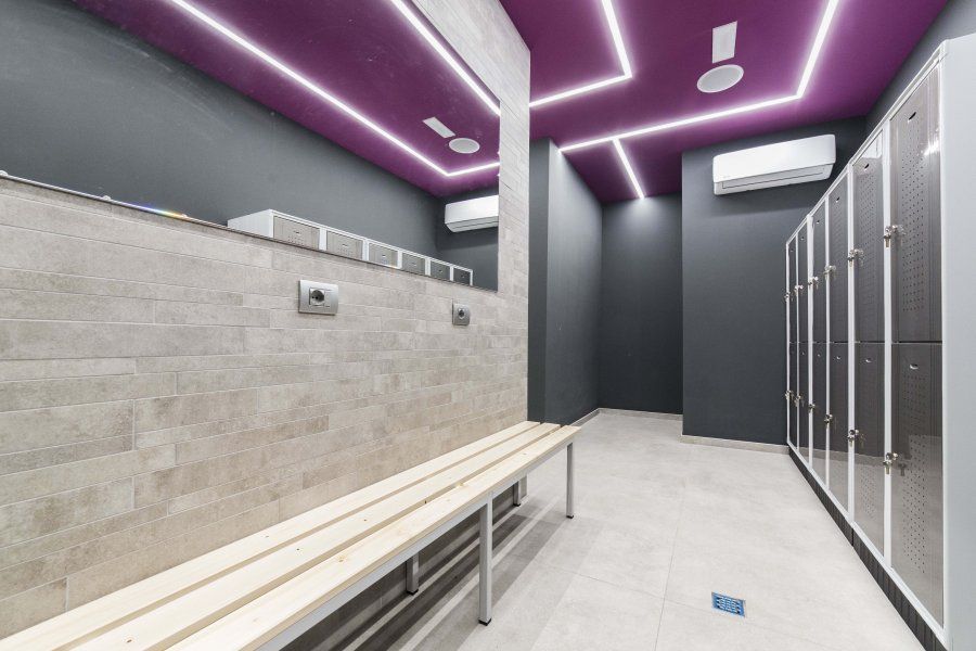 Раздевалки и служебные помещения естественным образом вписаны в общий дизайн. Стены и полы облицованы плиткой из коллекции PERONDA двух оттенков (светло-серого и голубиного пера), которая поразительно смотрится вместе с зеленым потолком. Керамогранит SONAR "под бетон" в стиле индустриальный шик воплощает атмосферу столичных городов. В линейку включены модели трех цветов (серый, серовато-бежевый и антрацит), множества форматов и толщиной 20 мм, что допускает разнообразные способы их применения в интерьерах и наружных зонах. Идеальным завершением проекта стали металлические дверцы шкафчиков и светодиодные ленты.