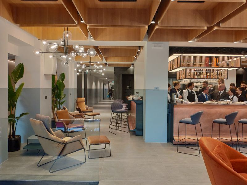 Плитка Blue Savoy марки Flaviker позволила подчеркнуть контраст между индустриальной строгостью керамогранита под камень и металлическими элементами в конструкции столов с деревянной обшивкой и мягкими тканями теплых ярких оттенков.