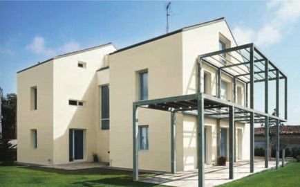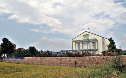 Кроме того, крыша без карниза, как принято в странах побережья Атлантического океана, никогда не создает на фасадах теней, которые могли бы нарушить их белизну. Только легкая металлическая решетка, просто прислоненная к главному фасаду во избежание возникновения мостиков холода, создает приятные и неожиданные эффекты светотени. Покрывающая здание «кожа» из керамического материала играет не только эстетическую функцию: она является лучшим выбором для экономии расходов и повышения комфортности жилья, благодаря своей изолирующей функции и идеальной тепловой защите (от воздуха, воды и света). Внутреннее распределение пространства отличается рациональностью (в полной гармонии с формой дома): гостиная расположена на первом этаже и выходит окнами на покрытое тиковыми досками патио, а на втором этаже находится более уединенная часть со спальнями родителей и детей и прилегающими к ним ванными комнатами. Внутри, как и снаружи, господствует белый цвет, подчеркивающий то ощущение чрезвычайной чистоты и рассеянного света, которое характеризует весь проект.