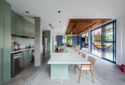 Из кухни обустроен выход на террасу, и именно она служит основным источником света. Открытая планировка и минималистичный дизайн мебели придают пространству некоторую строгость, которая смягчается за счет яркого мятного цвета и дерева на потолке.