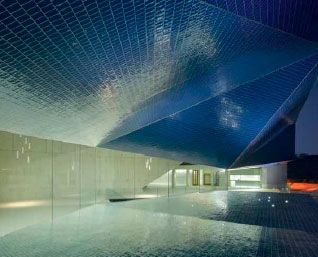 Гладкие и плавные формы облицованы керамогранитной плиткой, поддерживающей концепцию открытого фасада. Этот глубокий фасад напоминает тщательно отшлифованный алмаз, грани которого расположены таким образом, чтобы избежать прямого попадания солнечных лучей, столь жарких в этих средиземноморских широтах. Верхняя часть здания, угловатой, словно разорванной геометрической формы, также облицована керамической плиткой, которая создает здесь интересный эффект перемещения в пространстве. Днем она напоминает каменистый пляж, который издалека как будто сливается с морем. Ночью, когда мощный прожектор освещает дорогу, связывающую Теуладу и Морайру, та же поверхность напоминает театральные декорации. Именно керамика обеспечивает зрелищность и драматизм этого проекта.