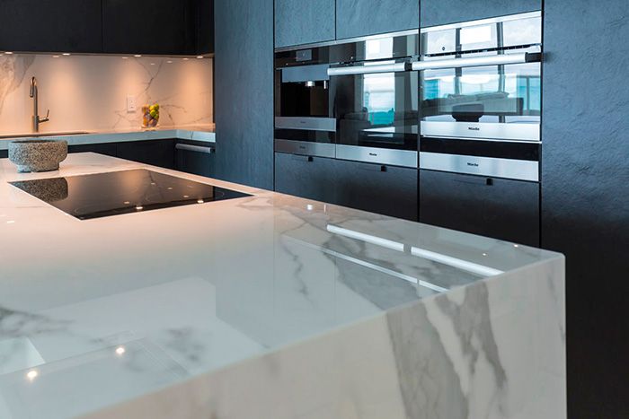 Та же самая модель использована для формирования столешницы в кухне, фартука и островка, придавая этой зоне элегантность и гармоничность. Модель вдохновлена каррарским мрамором, выполнена в белых и серых оттенках, с полированным покрытием, что создает зеркальный эффект с идеально ровным отражением.