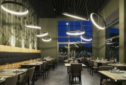 Значимую роль в проекте играет освещение, подчеркивая каждую деталь. Все внимание в ресторане привлекают светильники Delta Light Superloop с возможностью регулирования яркости. Кольца трех размеров направляют потоки света вверх и вниз по всему помещению. В других зонах ресторанах (вход, коридор, ванные комнаты) использованы прожекторы и светодиодные ленты.