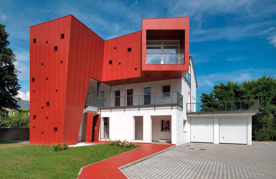 Намеренно сохранив строгость предыдущего здания, архитекторы создали надстройку, выглядящую как совершенно инородное тело. Для того чтобы еще более подчеркнуть разрыв между двумя частями проекта, поверхность пристроек была покрыта вентилируемой стеной из полированного керамогранита красного цвета. Этот цвет был использован также для придания яркости и неповторимости всей архитектуре здания, начиная от ведущей к нему дорожки до самого дома, выделяя превосходный объем входной двери, отсек внешней лестницы и расширенный второй этаж, который приобрел форму внушительного, выступающего вперед корпуса с бельведером художественной галереи «Ферреро».