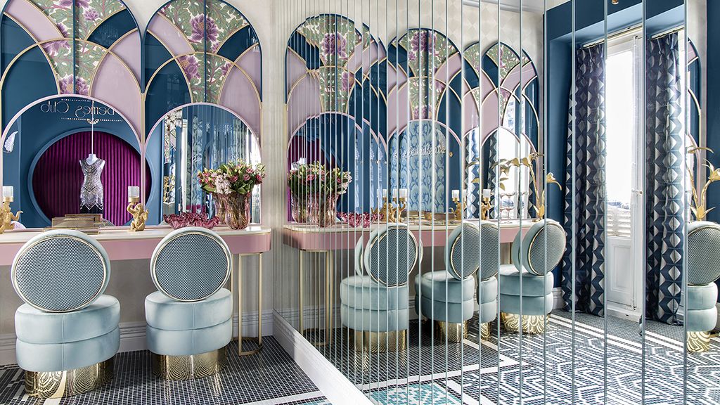 Еще один поразительный дизайн пола можно будет увидеть в проекте VG Living "The Berries Club". Изысканный будуар чествует эпоху ревущих двадцатых. Он объединяет комнату, гардеробную и ванную, которые словно предназначены для девушек флэпперов.